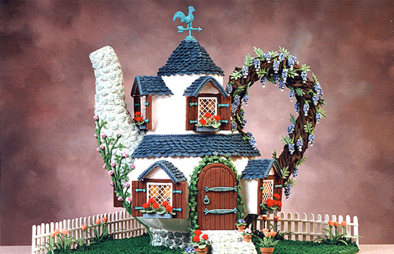 What goes better with a crunchy gingerbread cookie than a nice pot of tea? In this case, the tea pot is the gingerbread house! The flowers that line the spout resemble vines, while other flowers fill the windowsills and are planted in pots on the lawn.
