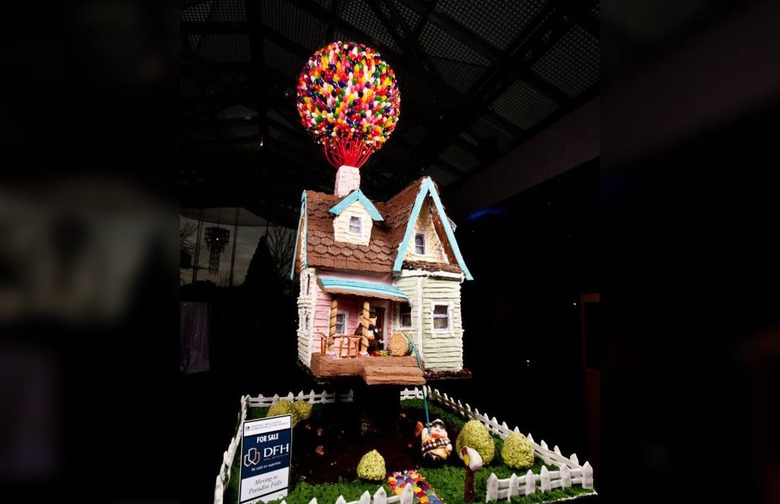 This gingerbread house, inspired by Disney's Up, perfectly captures the moment Carl's house lifts off the ground after he ties thousands of balloons to the roof. The colorful balloons are made out of jelly beans, and the pathway to the house is made out of M&M's, giving this gingerbread house the perfect touch of color.