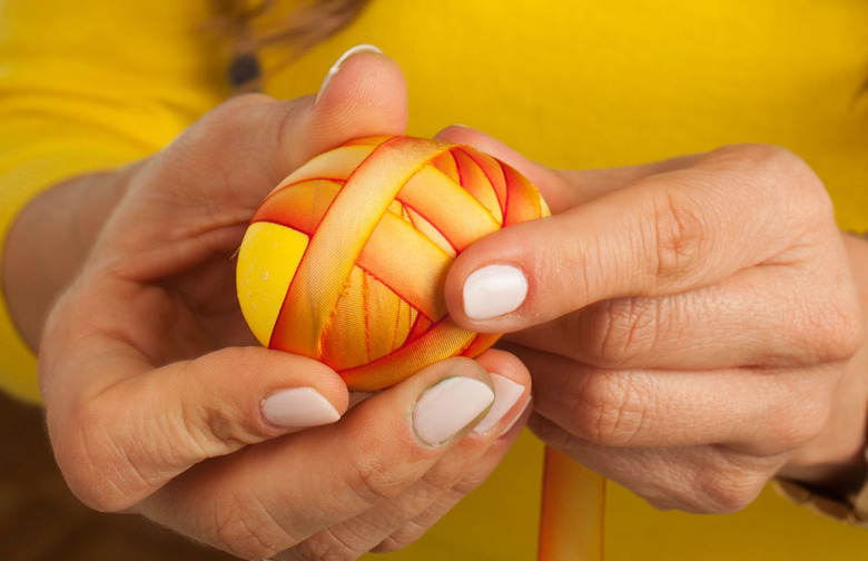 If you are looking to create a personal and fun Easter egg, gathering together a bunch of funky ribbons may just be the ticket! Just make sure that your ribbons are no wider than a half an inch. That way, you can wrap several different fun colored or patterned ribbon strands around your Easter eggs.