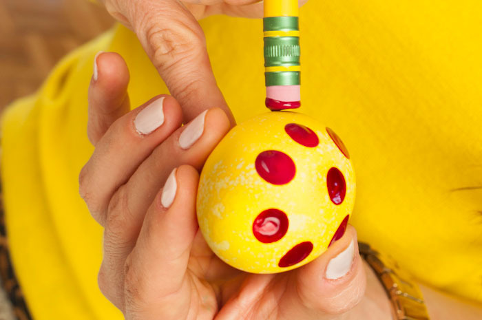 Easter egg dyeing is supposed to be a fun and funky venture. A plain Easter egg just isn't going to do! If you love the look of polka dots, this simple decorating tip will delight you. After dyeing your eggs with a base color, all you'll need is a pencil and a few drops of paint. Get wild with a pattern or go polka dot crazy!