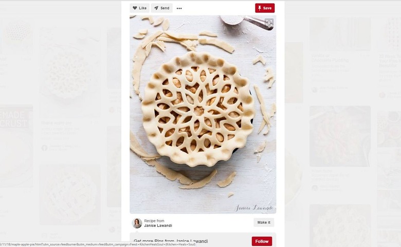 In order to let steam release from a fruit pie while it cooks, it's important to create (at the very least) a few small slits in the top crust. This maple apple pie takes that concept and cranks it up to 11 with an intricate series of windows. The design somewhat reflects a snowflake or flower but is strangely mesmerizing and still oh-so-perfect for fall.