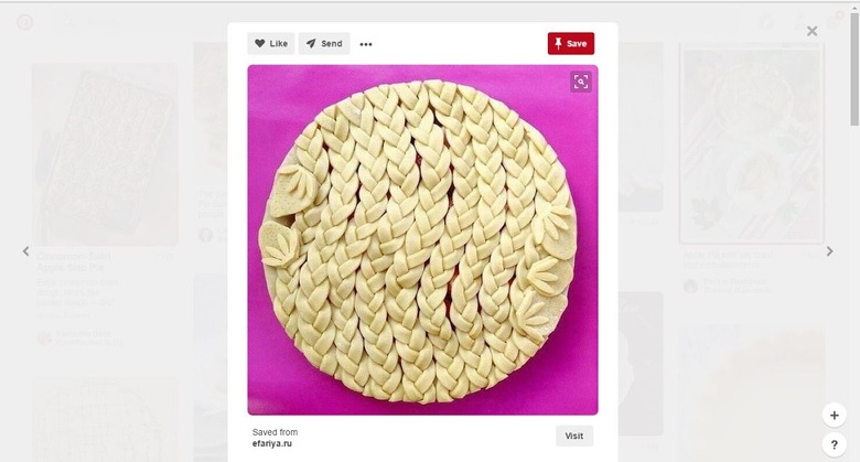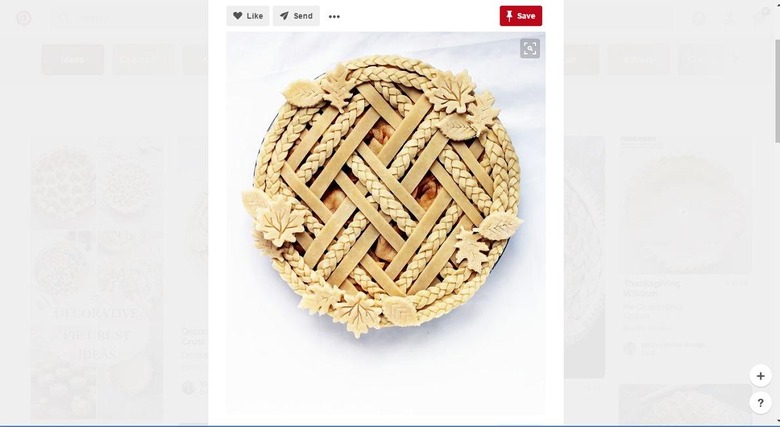 Your average checkerboard lattice pie looks like a chump next to this dizzying design. Braided lines intersect with plain pieces of crust, creating an optical illusion you can't stop staring at. As if the crisscrosses weren't enough, small cutout leaves on the edge of the pie add a perfectly appropriate autumn motif.