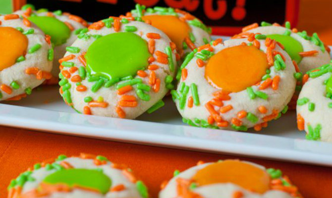 If you're looking for a Halloween treat that is simple, these thumbprint cookies from A Family Feast just use Halloween colors to give these sweets a festive pop of color.