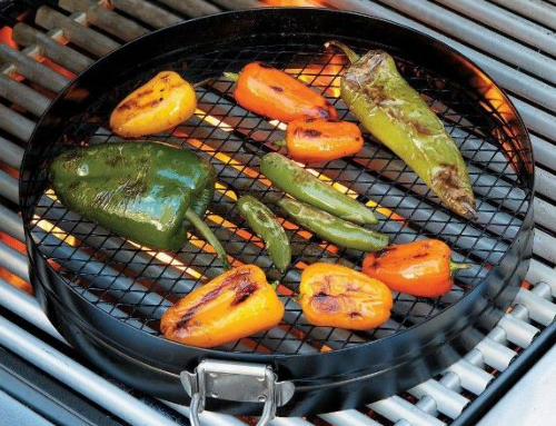 - Grill baskets: Baskets help you cook large amounts of small pieces of food without risking them falling between the grill grates.