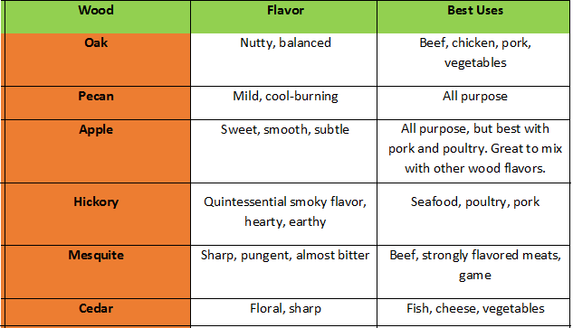 - Wood-burning smokers: These deliver classic flavors and aromas, and different types of hardwood can be used to create distinct flavors (see chart below).