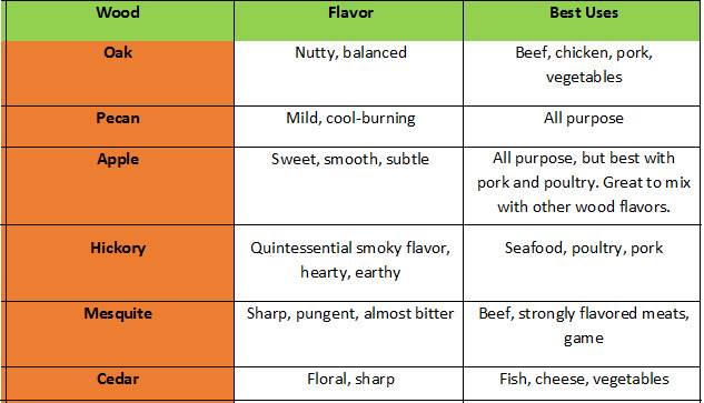 - Wood-burning smokers: These deliver classic flavors and aromas, and different types of hardwood can be used to create distinct flavors (see chart below).