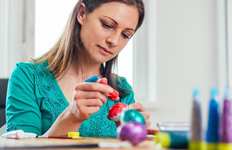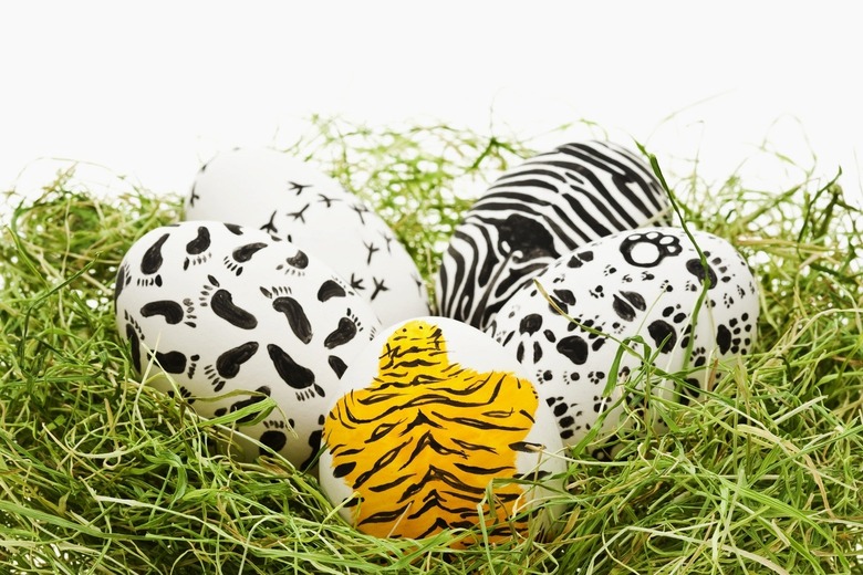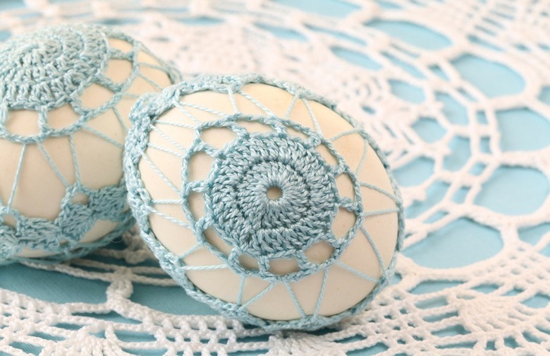 Your grandma's doilies can be used to decorate lacy eggs in two ways. First, you can use a hot glue gun to adhere the doilies to your eggs in scalloped layers, creating a tutu-like effect. If that doesn't sound like your decorating sense, you can use the doilies as a stencil for blank space on your eggs by laying them against a white egg and painting over them. After the paint has dried, lift the doily, and you'll be left with a lacy pattern on your eggs.