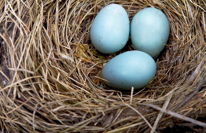 To make your chicken eggs look like gigantic robin's eggs, the first step is to use a dye kit of food coloring mixture and dye your eggs a light shade of blue. Then, tear off bits of porous sponge (ideally a natural sponge) and dip it in a watered down, light brown paint. Dab the paint on the blue eggs for a speckled effect.