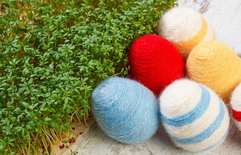 If you look at Easter eggs and decide they need sweaters, you can easily wrap them in yarn for a cozy look. Just apply crafting glue adhesive to a small section at one end of the egg and start wrapping the yarn around the egg. As you continue down the egg, work in small sections applying glue and wrapping the yarn until the egg is covered.