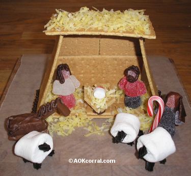 Gum drops, marshmallows, and candy bars all account for the figurines in this nativity scene, and are pretty convincingly constructed if you ask us! We love the shredded cheese for hay and the graham cracker construction.
