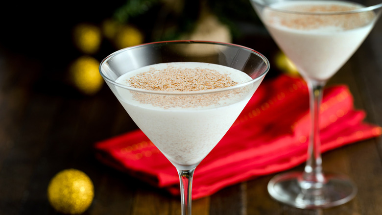 This eggnog martini omits the raw eggs and instead uses white chocolate liqueur for a smooth, creamy holiday cocktail.