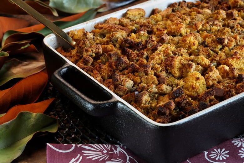 Stuffing is an integral part of Thanksgiving and is best when made day-of. Take your dried bread, add all of the onions and celery and other veggies you chopped up the night before, season them liberally and coat them in chicken stock. A classic stuffing recipe takes about one hour from start to finish.