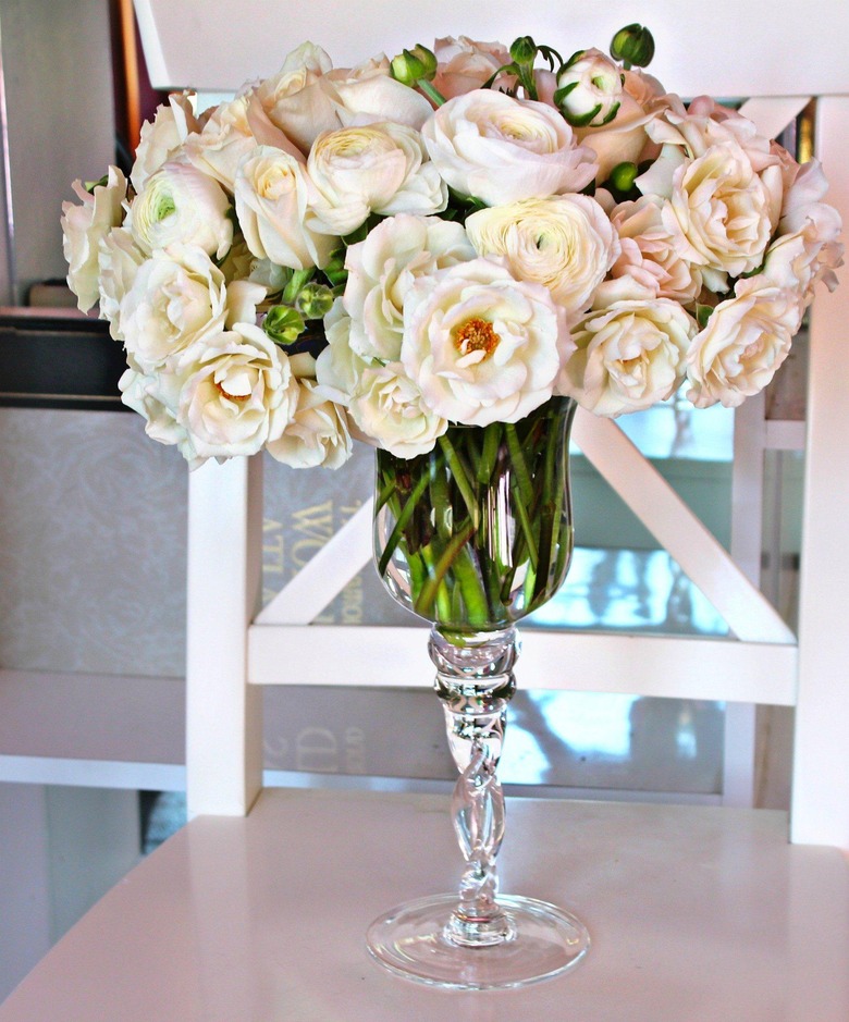 The designer aesthetic can be accomplished by pairing a compact mix of blooms with a sophisticated vase, like in the arrangement featured above. The florist here has combined ivory roses, white ranunculus, and spray roses, which would look lovely in an entryway or anywhere where they can be displayed prominently.