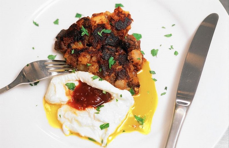Don't let the fancy name intimidate you, croque madame is more or less a regular old breakfast sandwich topped with a fried egg. What really makes the dish shine is the rich bechamel sauce and gruyere cheese.