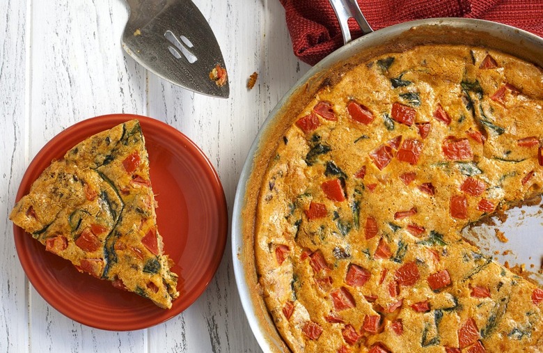 If you need to use up a lot of eggs, a frittata is a good way to do it. This ham and cheese frittata takes 12 eggs and is ready in just 30 minutes. The fluffy, protein-packed mixture of ham, cheese, tomatoes and spinach is a light and tasty way to kick off the new year.