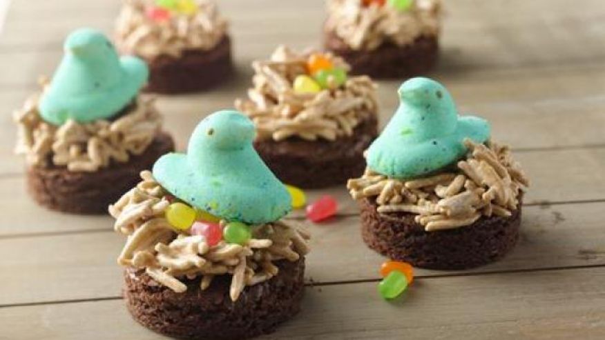 These colorful little nests will be fun for kids of all ages to assemble. Mix up the Peeps toppers with different colors and flavors of chicks. Mix up the "eggs" by using your favorite jelly bean or small, soft candy.