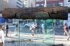 An impossible-looking structure where walls of glass maintain the weight of a massive tree trunk.