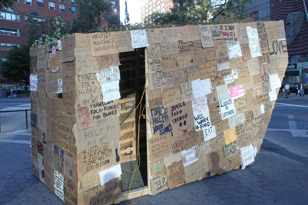 Using cardboard messages from those in need of a home as the walls of the shelter, the creeds of Sukkot couldn't be more profoundly expressed.