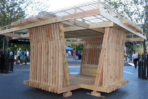 Hundreds of thin wooden boards stacked in two directions to create the communal space.