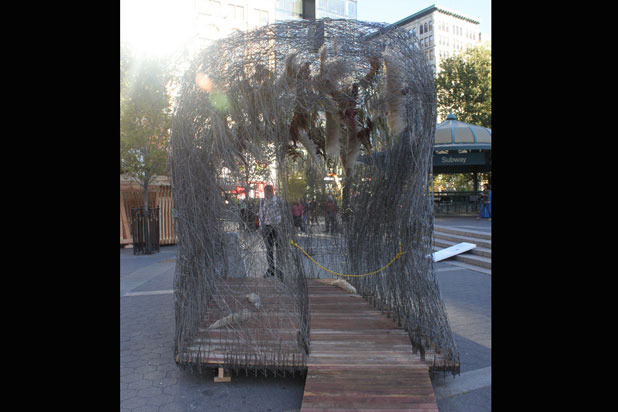 On a raised platform, this structure appears to float in the air. Its wiry canopy allows fresh air and light to stream in from all angles.