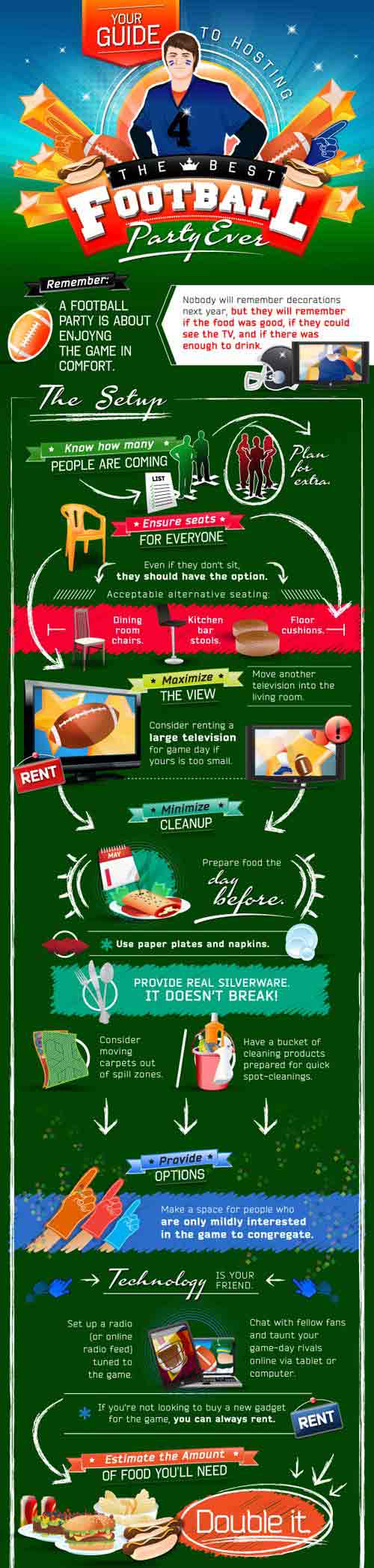 Some hints? Provide paper plates and napkins, but use real silverware that doesn't break. Stock up on chips and dip, carrots, and celery (fast finger food always wins), grab a cooler to keep extra drinks cold, and don't forget to add ice.