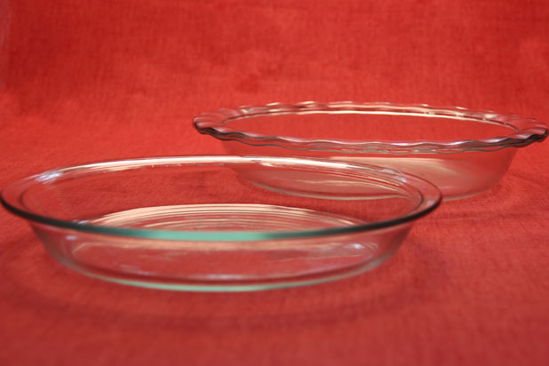 Make sure to use the size pie plate that's called for. Note how the 9-inch pie plate in the foreground is much more shallow that the 9 ½-inch in the rear. Pyrex pie plates allow you to see how the crust is browning and are easy to find, even in many large supermarkets.