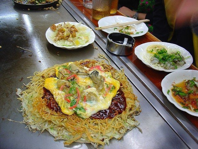 Additionally, okonomiyaki is often topped with okonomiyaki sauce, which is said to be similar Worcestershire sauce, as well as seaweed flakes, bonito flakes, Japanese mayonnaise, and pickled ginger.