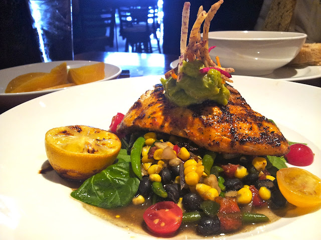 Maintaining their seasonal and healthy edge (nothing is fried and all dishes are under 475 calories), the flavor abounds as much as my first visit to this chain's location almost exactly (coincidentally) a year ago (Reviewed Here). Exciting to my tongue was the special Mahi Mahi (pictured) with a charred crisp that melted into tender but fleshy morsels. Devoid of any fishy bite, the mellow meat was amplified by a festive corn and bean salad, punctuated with juicy grape tomatoes and wilted greens. A thoughtful dollop of fresh guacamole studded with crunchy root vegetable straws decadently crowned the Mahi monument. My side order (also a daily special and pictured) of sweet and sturdy roasted yellow beets could not have been more compatible if they had been integrated to my main dish.