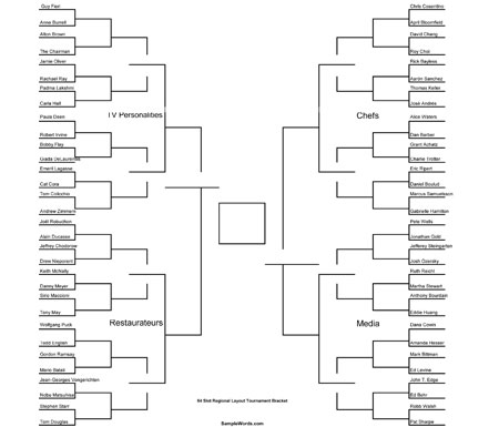 Taking inspiration from last year's Food Fight, we thought it would be fun to pit a roster of culinary superstars against each other in competition. We didn't seed them, but arranged them into four categories: TV food personalities, restaurateurs, chefs, and food writers.