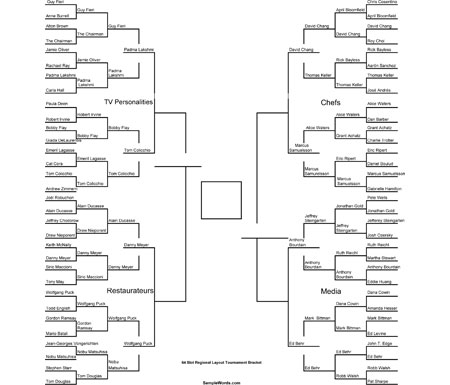 Taking inspiration from last year's Food Fight, we thought it would be fun to pit a roster of culinary superstars against each other in competition. We didn't seed them, but arranged them into four categories: TV food personalities, restaurateurs, chefs, and food writers.