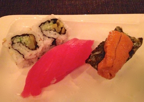 For the finale, diners enjoyed a simple cucumber roll, a thick slice of tuna, and a generous portion of uni atop nori and rice. Dessert was a simple green tea cake, a light and satisfactory conclusion to the meal.