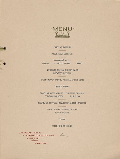 The meal that evening started with fillet of sardines (a much classier dish back then than it is now), crabmeat cocktail, consommé, and radishes, olives, and celery. The fish course was Kennebec salmon with shrimp sauce and potatoes, followed by green pepper farcie, which were just peppers stuffed with ground beef and baked. Next came orange sorbet as a palate-cleanser, then roast chicken with chestnut dressing, peas, and potatoes Saratoga, what are we call potato chips today (it's widely accepted that they were invented in Saratoga, N.Y.). Then came salad (it wasn't uncommon for salad to be served after the main meal back then, as lettuce helps digestion), and finally a dessert of peach parfait with whipped cream and "fancy wafers." Quite a feast!