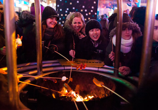 Now that you've honed your elocution of Quebecois French, let's delve into the details of MEL via a familiar comparison: it's the Northern answer to Mardi Gras, as they strike around the same time each year, substituting French onion soup, smoked meat sandwiches, parkas, and an enchanting, snowy setting in place of New Orleans' signature gumbo, po' boys, bead necklaces, and boozy parades. Instead of rambunctious crawfish boils at Audubon Park fueled by tipsy tourists, Tulane students, and truckloads of Turbodog, you'll find ski bums, socialites and students from McGill intermingling around public fire pits on Rue Sainte Catherine, toasting marshmallows and roasting cocktail franks on wooden skewers as snowflakes settle on the tips of their noses.