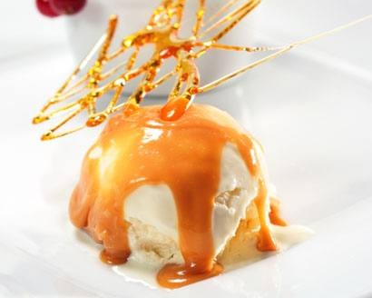 - Put a scoop of ice cream into a bowl, place fresh berries and sauce on top.