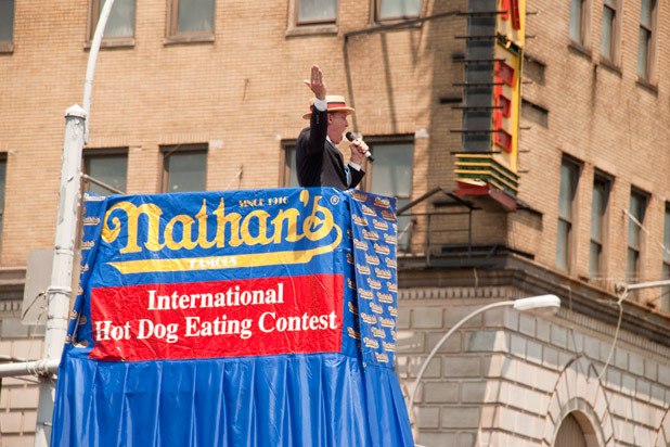 Host Jon Hein of Fast Food Mania gets the crowd going outside Nathan's Hot Dogs on Coney Island July 4.