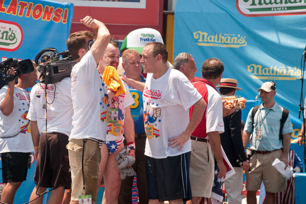 The three winners of the men's competition, including Tim "Eater X" Janus (second place) and Joey Chestnut (first), convene on stage. Chestnut ate 68 hot dogs; Janus ate 52.