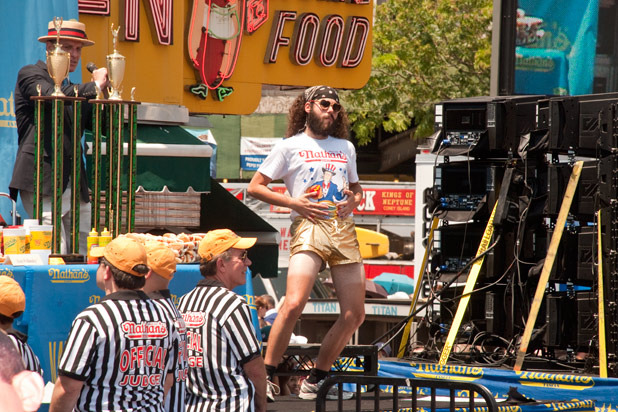 Competitor Patrick Bertoletti of Chicago ripped off his shorts onstage to reveal a Magic Mike worthy patriotic thong. He ended up eating 51 hot dogs, in third place.