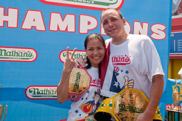 Winners Sonya Thomas and Joey Chestnut, at the end of it all.