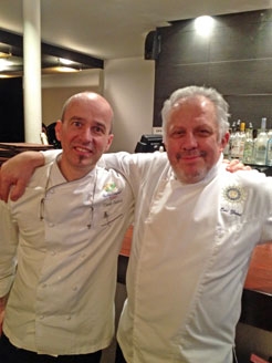 For dessert, chef Godard handed over the reigns to Master Chocolatier Eric Girerd (pictured, right). Chef Girerd is the man behind L'Atelier Du Chocolat, one of New York's finest gourmet chocolate shops and a participant in this year's Chocolate Week. In honor of Chocolate Week chef Girerd prepared an example of the "Bubbly Gourmand" promotion. The mignardises was a chocolate mousse Napoleon with spiced pear that was paired with a Cremant De Bourgogne Rose. Samples of chef Girerd's gourmet chocolates, with flavors like Evasion (dark chocolate with ginger and strawberry) and Maya (with hazelnut and chipotle) were also served. It was the perfect end to a wonderful meal.