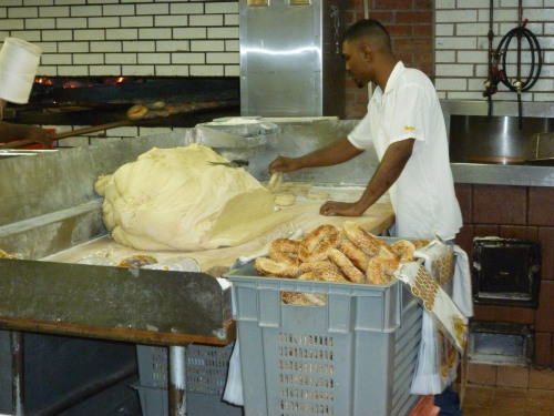 A worker at Fairmount Bagel preparing the dough into recognizable bagel shapes. (Wikipedia)