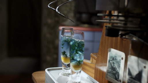 Two cocktails are created by the pianocktail in Drafthouse Films' Mood Indigo. Courtesy of Drafthouse Films.