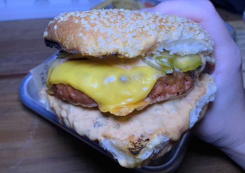 Before the Awesome Burger's official launch on Oct. 1, Sweet Earth held a special event on the Roof at Park South Hotel in New York City, where one of our editors got to try it. The brand's culinary innovation and product development chef, Tucker Bunch, used the same recipe for the hotel's Wagyu cheeseburger, subbing out the beef for the Awesome Burger patty. The burger came prepared with American cheese, dashi pickle, special sauce (comparable to Chipotle mayo) and red onion on a soft sesame seed bun.