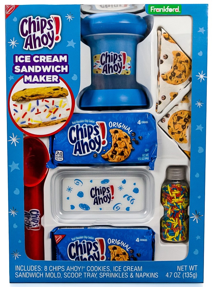 The brand-new cookie contraption is set to hit store shelves as early as Oct. 28. Brought to you by the same company that created the Oreo kit, Frankford Candy, the Chips Ahoy Ice Cream Sandwich Maker features eight Chips Ahoy chocolate chip cookies, an ice cream sandwich mold, an ice cream scoop, a small tray, rainbow sprinkles and napkins. It retails for $14.98. All you have to do is buy ice cream.