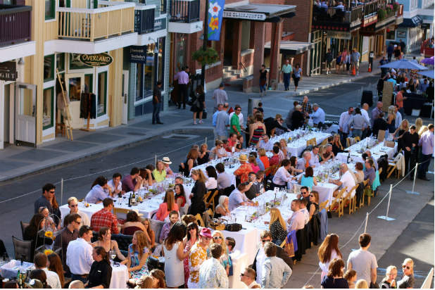 I was fortunate enough to attend this year's event, and I can assure you that this is a food event worth traveling for. Park City's quaint Main Street is shut down and lined with tables decked out for a feast. Select local restaurants each fill one long table that's usually decked out for the occasion—my table featured bright blue glass bottles and classic Western décor like cactus flowers—and offer special menus for the event. The whole thing was like something out of someone's dream. As the sun was setting on the summer solstice, attendees began reveling with pre-dinner cocktails and live bands. The musicians near my table at Park City's High West Distillery & Saloon (the only ski-in distillery in the country, respectively) churned out 80s rock hits while I downed a mixed drink.