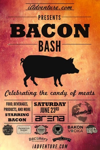 The first Bacon Bash 2012 is quickly approaching as a sort of culminating ceremony in our culture's moment of fervent bacon-worship. Lovers of the "candy of meats" will gather in Times Square's Arena Event Space June 23 to engage in some serious summertime bacon gluttony, with food from restaurants like Tommy Lasagna, Lucky 777 Chili Company, and Little Town NYC, among others. Bacon will make appearances in both savory and sweet treats, with boozy-cupcake purveyors Prohibition Bakery and Baconery (Bacon + Bakery) on site for sweet-tooth strikes. And if you're really looking to party hard, bacon vodka shots will be available for whoever might be interested.
