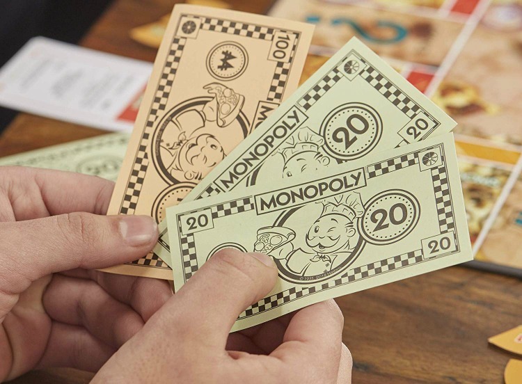 Rich Uncle Pennybags, aka Mr. Monopoly, the mustachioed guy who appears on all Monopoly games, is featured on the game's money holding a pizza slice so cheesy it's about to drip right out of his hand.
