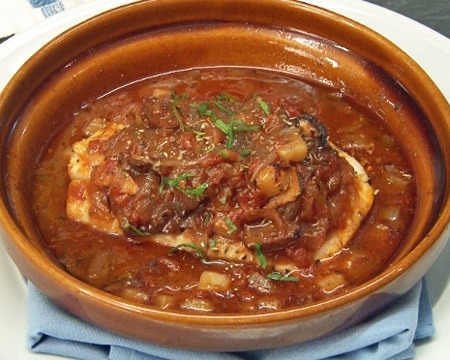 - Season the fish with salt and pepper, to taste, and place about 1/3 of the sauce in the bottom of a shallow 2-quart baking dish large enough to hold the fish. Place the fish on top of the sauce and cover the fish with remaining sauce.