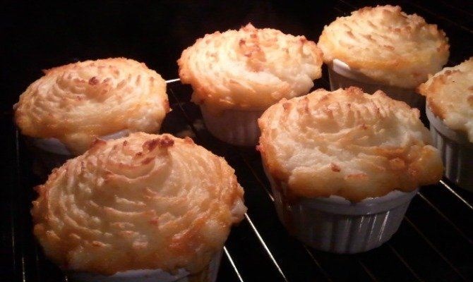 - Heat oven to 375 degrees. Arrange a layer of potatoes in the bottom of a small casserole dish. Sprinkle with a portion of the cheese, some of the garlic, and season with salt and pepper. Repeat for 2 more layers. Add the chicken stock. Cover with foil and bake for 25 minutes. Uncover, and bake for an additional 20 minutes until brown.