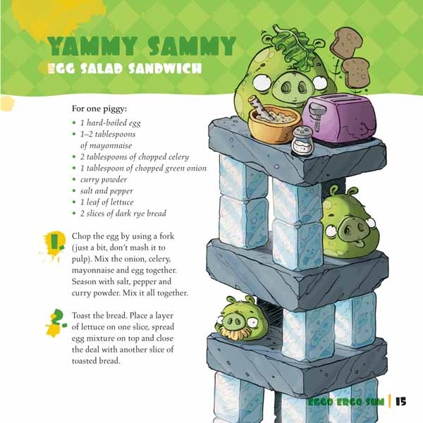 Last week we reported that the Angry Birds Cookbook was finally out, and now, we've gotten our hands on four recipes from the egg-centric 96-page book. For your viewing pleasure, here's the bad piggies' recipes for Yammy Sammy; Grilled Delight; Ice, Ice Baby; and Puffies. Let's not anger any birds in the making of these recipes, ok?
