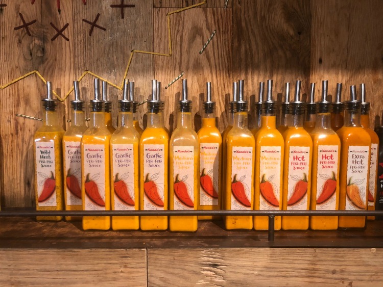 I also loved my side dish – enormous, moist sweet-potato wedges, served with a refreshing yogurt-mayo dip. They were practically a meal in themselves. The restaurant also boasted a sauce bar, featuring bottle after bottle of Nando's different sauces, from garlic to wild herb to three levels of hot, all the way up to the extra-hot. (Yes, I tried them all. Prince William and his mates probably have.)